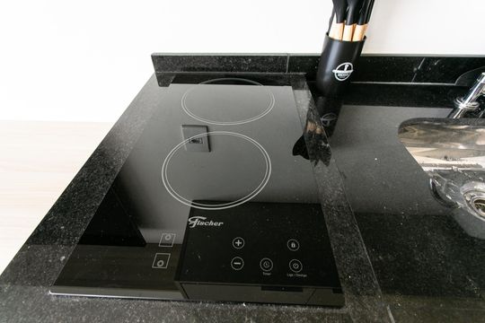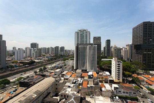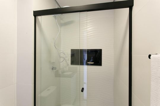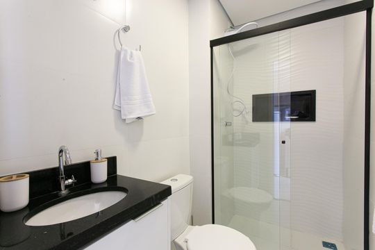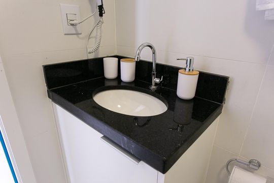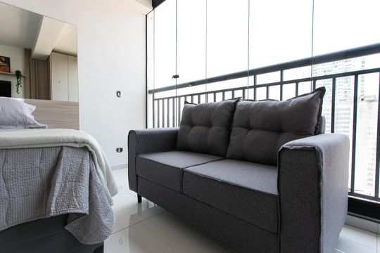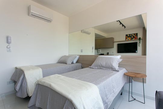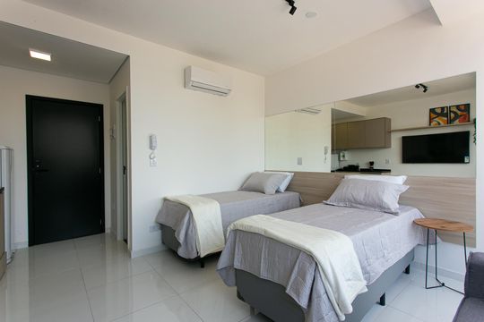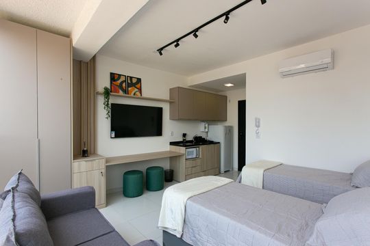 Box, Armários no quarto, Armários no banheiro, Armários na cozinha, Ar condicionado, Geladeira, Mesas e cadeiras de escritório, Sol da manhã, Sol da tarde, Janelas grandes, Vista livre, Microondas, Sofá, Televisão, Fogão cooktop, Cama de solteiro